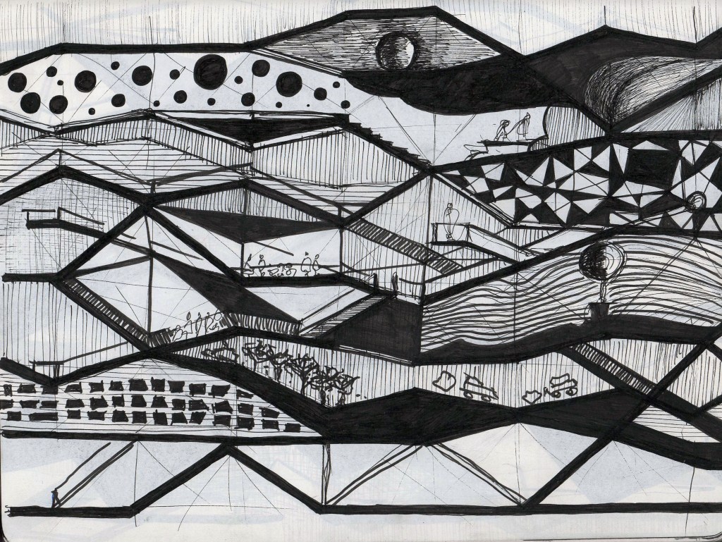 The interior gets generated by folding each floor, referred to a specific functional program, generating a structural and spatial sponge network.